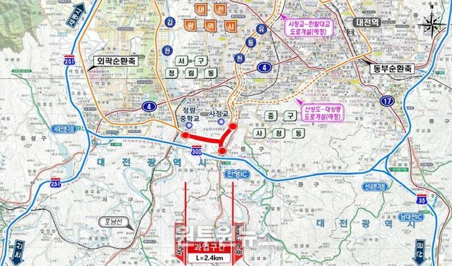 정림중~사정교간 도로개설은 교통 혼잡이 심한 국도 4호선 계백로(관저동~서대전네거리)의 교통량을 분산하기 위해 추진되는 사업으로, 총 연장 2.4km(터널 1개소·교량 3개소), 폭 20m, 왕복 4차선 규모로 개설된다.
