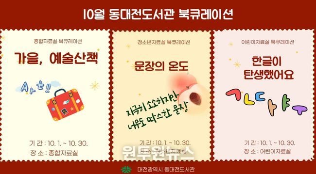 (원투원뉴스) 동대전도서관은 가을 독서의 계절을 맞아 10월 한 달간 연령별 맞춤 주제 북큐레이션 전시를 운영한다고 10일 밝혔다.