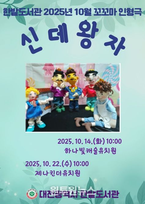 (원투원뉴스) 대전 한밭도서관은 어린이의 감정 표현과 상상력을 키우기 위해 유치원을 직접 찾아가는 독서문화 프로그램으로 손인형극 ‘신데왕자’를 공연한다.