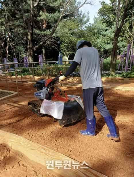 다른 1곳인 구미동 공공공지 내 750m 길이의 황톳길은 로터리 기기를 내년도에 추가 구매한 뒤 흙 뒤집기 작업을 한다.