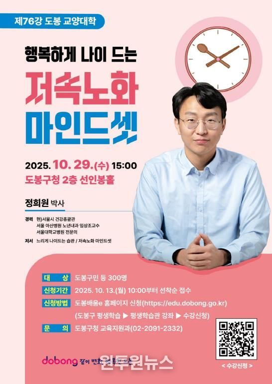 (원투원뉴스) 서울 도봉구가 10월 13일 오전 10시부터 ‘저속노화 마인드셋’ 특강 참여자를 모집한다.