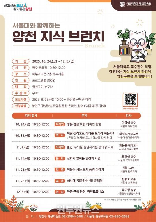 (원투원뉴스) 양천구는 구민의 인문학적 소양을 넓히고 평생학습 문화를 확산하기 위해 서울대 교수진이 직접 출강하는 고품격 교양 프로그램 ‘양천 지식 브런치’를 오는 10월 말부터 7주간 해누리타운 해누리홀에서 운영한다고 10일 밝혔다.