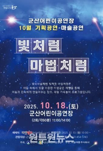 (원투원뉴스) 군산어린이공연장이 오는 10월 18일 어린이들의 상상력과 창의력을 자극하는 특별한 체험형 공연 '빛처럼 마법처럼'을 선보인다.
