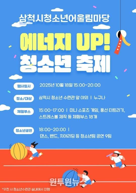 (원투원뉴스) 삼척시청소년수련관은 오는 10월 18일 오후 3시부터 관내 청소년과 가족을 대상으로 2025 삼척시청소년어울림마당 『에너지 UP! 청소년축제』를 개최한다.
