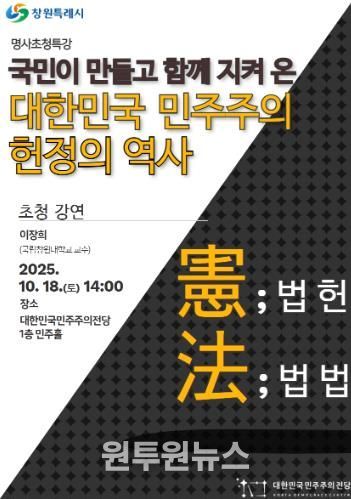(원투원뉴스) 창원특례시는 오는 10월 18일 오후 2시, 대한민국민주주의전당 민주홀에서 ‘대한민국 민주주의 헌정의 역사’ 특별 강연을 개최한다고 밝혔다.
