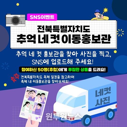 (원투원뉴스) 전북특별자치도는 10월 10일부터 11월 1일까지 도내 주요 축제 현장에서 ‘추억 네 컷 이동홍보관’을 운영한다고 밝혔다.