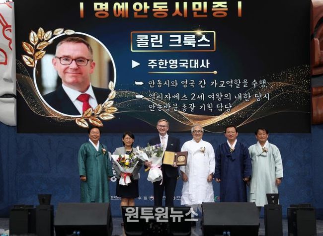 (원투원뉴스) 안동시는 지난 10월 3일 열린 제23회 ‘안동의 날’ 기념식에서 콜린 제임스 크룩스(Colin James Crooks) 주한영국대사에게 명예안동시민증을 수여했다고 밝혔다.