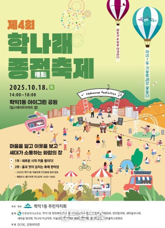 한편, 이번 축제는 학익1동 주민자치회가 주최·주관하고, 학익1동 행정복지센터를 비롯한 관내 자생 단체, 학익1동 우리마을교육자치회, 학산문화원이 협력하며, DCRE, 강원레미콘이 후원한다.