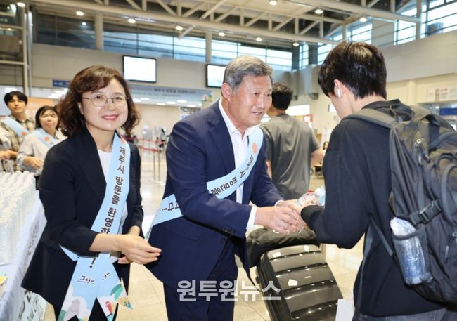 이날 김 시장은 장시간 승선으로 지친 방문객에게 시원한 삼다수를 전달하며 따뜻한 명절 분위기를 조성했고, 제주관광지도와 성안올레지도 등 각종 관광정보를 제공하며 일일이 환영 인사를 전했다.
