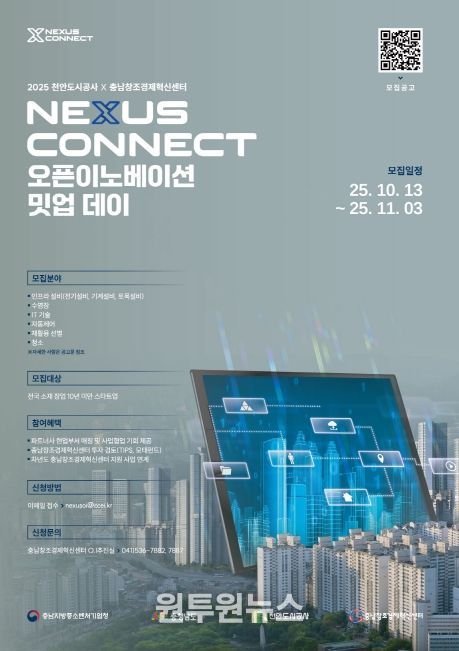 (원투원뉴스) (재)충남창조경제혁신센터와 천안도시공사(지방공기업)은 스마트 시티 (공공 인프라·시설운영)분야 스타트업을 발굴·육성하기 위해 ‘2025 천안도시공사 x 충남창조경제혁신센터 Nexus Conncect 오픈이노베이션 밋업 데이’참여 기업을 11월 3일까지 모집한다고 밝혔다.