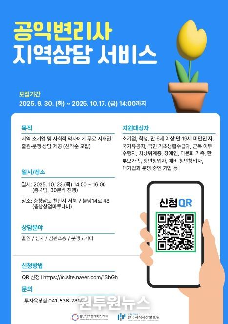 (원투원뉴스) (재)충남창조경제혁신센터는 오는 10월 23일 오후 2시~4시, 충남 천안시 불당동 소재 창업지원공간 충남창업마루나비에서 공익변리사 무료 상담 서비스를 운영한다고 밝혔다.