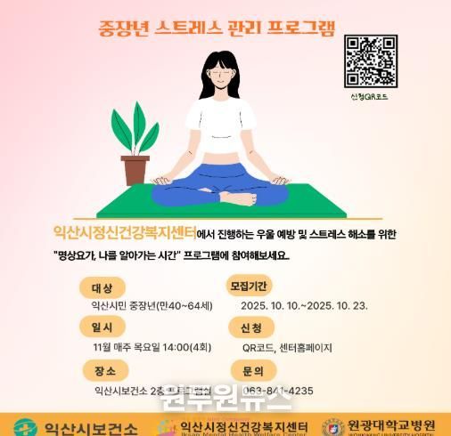 (원투원뉴스) 익산시정신건강복지센터는 만 40~64세 중장년을 대상으로 '마음힐링 명상요가' 프로그램을 운영한다고 10일 밝혔다.