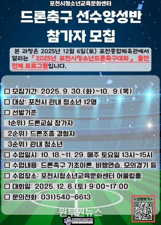 이번 프로그램은 12월 6일 포천종합체육관에서 열리는 ‘2025년 포천시 청소년드론축구대회’에 출전할 선수를 발굴·육성하기 위해 마련했다. 참가 청소년들은 드론축구 기초이론, 비행 연습, 모의 경기 등 체계적인 훈련 과정을 거쳐 최종적으로 대회에 출전하게 된다.