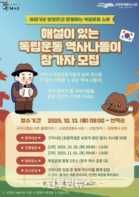 (원투원뉴스) 구리시는 오는 10월 13일부터 27일까지 교문 방정환 도서관에서 진행하는 ‘해설이 있는 독립운동 역사 나들이’ 프로그램의 참여자를 모집한다고 밝혔다.