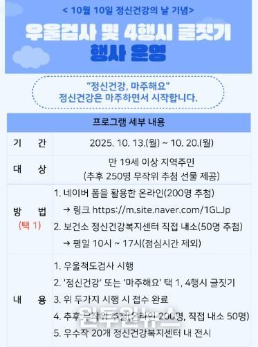 이번 행사는 만 19세 이상 지역 주민을 대상으로 진행되며, 우울감 조기 발견과 긍정적인 정신건강 메시지 확산을 위해 기획됐다.