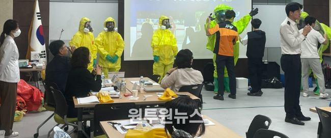 훈련은 ▲생물테러 대응 이론 교육 ▲개인보호복(레벨 A, C) 착·탈의 실습 ▲다중탐지키트 사용법 ▲현장활동 계획 수립 및 위험구역 설정 등 실습 위주로 진행됐다.