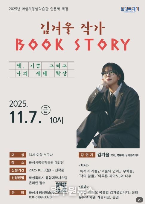 (원투원뉴스) 화성특례시는 오는 11월 7일 오전 10시, 화성시평생학습관에서 김겨울 작가를 초청해 인문학 특강을 개최한다고 밝혔다.