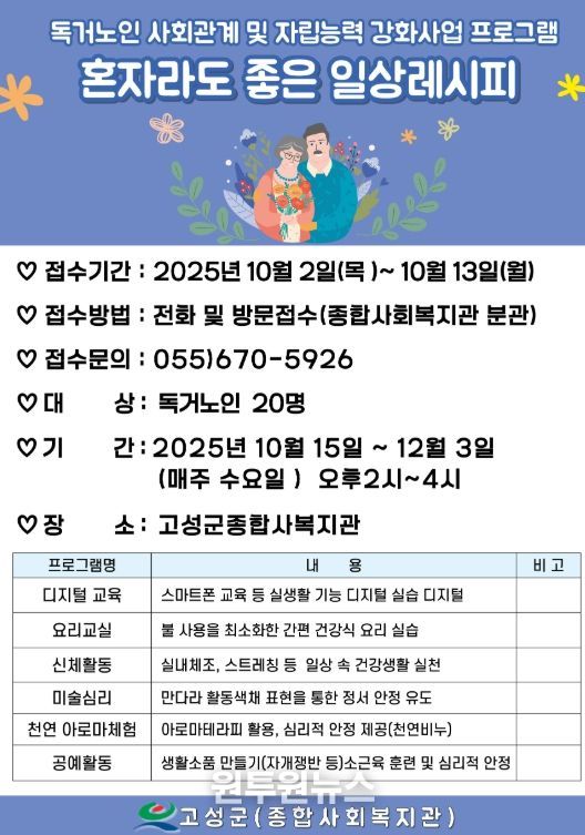(원투원뉴스) 고성군은 10월 2일부터 13일까지 고성군종합사회복지관에서 독거노인 어르신을 대상으로 독거노인 자립 및 사회관계 형성 프로그램 ‘혼자라도 좋은 일상레시피’ 참여자를 모집한다.
