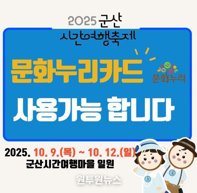 (원투원뉴스) 군산시가 12일까지 열리는 '2025 군산시간여행축제' 기간 동안 통합문화이용권(문화누리카드) 임시 가맹점을 운영해 시민들이 축제 현장에서 더욱 쉽고 편리하게 통합문화이용권(문화누리카드)를 사용할 수 있도록 지원했다.