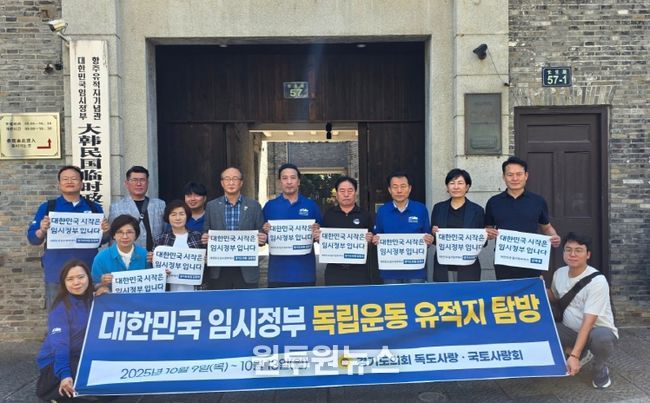 (원투원뉴스) 광복 80주년을 맞아 중국 내 독립운동 유적지를 탐방 중인 경기도의회 ‘독도사랑ㆍ국토사랑회(회장 김용성 의원)’와 ‘역사바로세우기 경기연대(수석부회장 김성수 의원)’는 10일, 처절했던 임시정부 이동 역사의 첫 기착지인 항저우(杭州) 임시정부 청사를 찾아 절망 속에서도 다시 희망의 불씨를 지폈던 선열들의 숭고한 고난을 되새겼다.