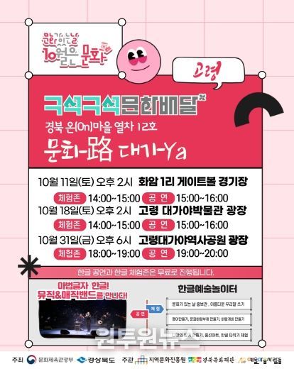 (원투원뉴스) 2025 문화가 있는 날 '구석구석 문화배달' 경북 온(On)마을 열차 12호 고령군 ‘문화路 대가ya’가 10월 문화의 달을 맞아 총 3회의 공연을 선보인다. 이번 행사는 문화체육관광부와 경상북도가 주최하고, 지역문화진흥원·경북문화재단·예술마을사람들이 주관하며, 고령군과 협력해 진행된다.
