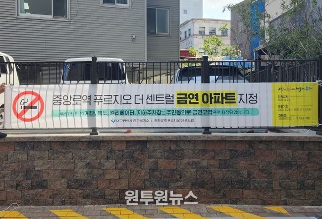 (원투원뉴스) 대구 중구는 공동생활공간 내 간접흡연으로부터 주민 건강을 보호하고 쾌적한 금연 환경을 조성하기 위해 ‘대구역 센트럴 대원칸타빌’(태평로 224)과 ‘중앙로역 푸르지오 더 센트럴’(서성로 60)을 각각 제24호, 제25호 공동주택 금연구역으로 지정했다.