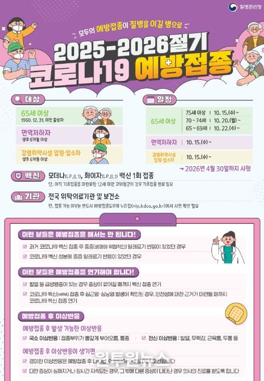 이번 접종은 코로나19 재유행과 중증화 예방을 위해 진행되며, 무료 접종 대상은 65세 이상 어르신과 감염취약시설 입원·입소자, 면역저하자이다. 어르신 접종은 연령별로 순차적으로 진행된다.