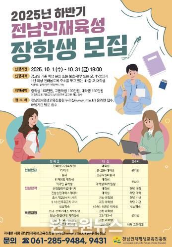 (원투원뉴스) 전라남도와 전남인재평생교육진흥원은 실질적인 교육기회 보장과 미래인재로의 성장, 지역 정착을 지원하기 위한 2025년 하반기 전남인재육성 장학생을 오는 31일까지 모집한다.