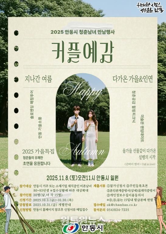 (원투원뉴스) 안동시가 청춘남녀의 건강한 만남을 지원하기 위해 마련한 ‘2025 커플예감! 힐링피크닉’ 시즌4 참가 신청을 10월 30일까지 접수한다.
