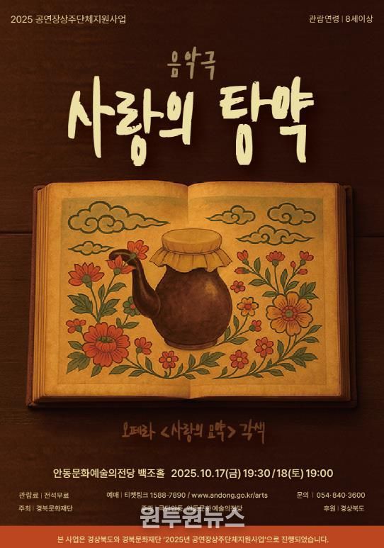 올해 선정된 상주단체 ‘극단안동’은 한국적 소재를 바탕으로 연극과 뮤지컬, 음악극, 거리 퍼포먼스 등 다양한 장르를 넘나들며 활발한 창작 활동을 이어가고 있다. 창작 음악극 '사랑의 탕약'은 10월 17일 오후 7시 30분과 18일 오후 7시, 양일에 걸쳐 안동문화예술의전당 백조홀 무대에서 열린다.