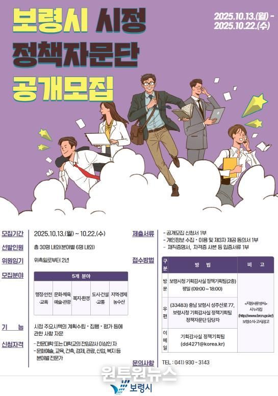(원투원뉴스) 보령시는 지역 시정 발전에 대해 조언·권고·건의 등의 자문을 얻고자 보령시 시정 정책자문단 신규 위원을 10월 13일부터 22일까지 10일간 공개 모집한다고 밝혔다.
