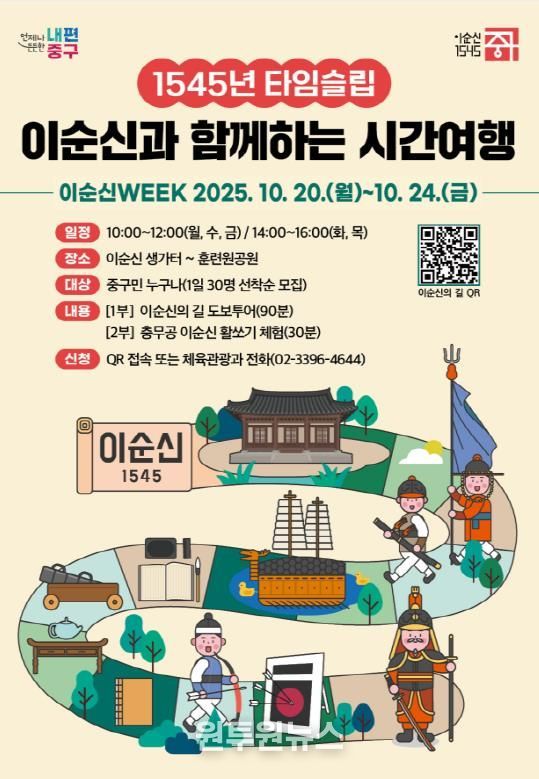 (원투원뉴스) 충무공 이순신의 고향, 서울 중구가 이순신 장군의 발자취를 따라 걷는 도보투어와 무예 정신을 되살리는 활쏘기 체험 프로그램을 오는 10월 20일부터 24일까지 운영한다.