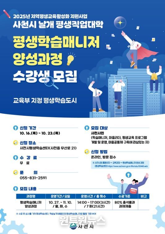 (원투원뉴스) 사천시는 10월 16일부터 10월 23일까지 2025년 지역평생교육활성화 사업 중 ‘평생학습매니저 양성과정’ 수강생을 모집한다고 13일 밝혔다.