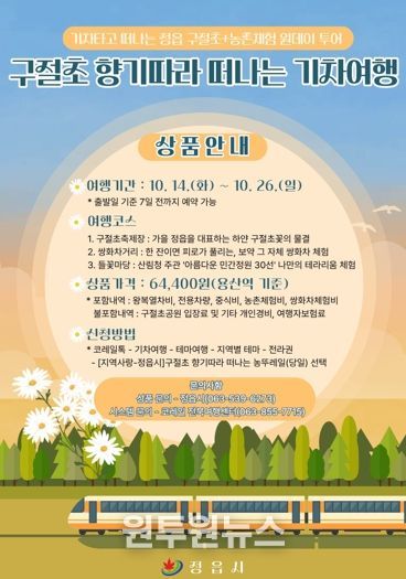(원투원뉴스) 정읍시농업기술센터가 가을 여행철을 맞아 구절초 꽃축제와 농촌체험을 엮은 기차여행 상품 ‘농뚜레일 투어’ 참가자를 오는 19일까지 모집한다.