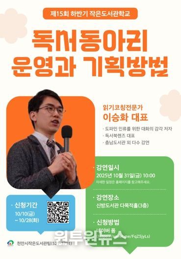 (원투원뉴스) 천안시는 오는 31일 신방도서관에서 ‘제15회 하반기 작은도서관학교’를 운영한다고 13일 밝혔다.