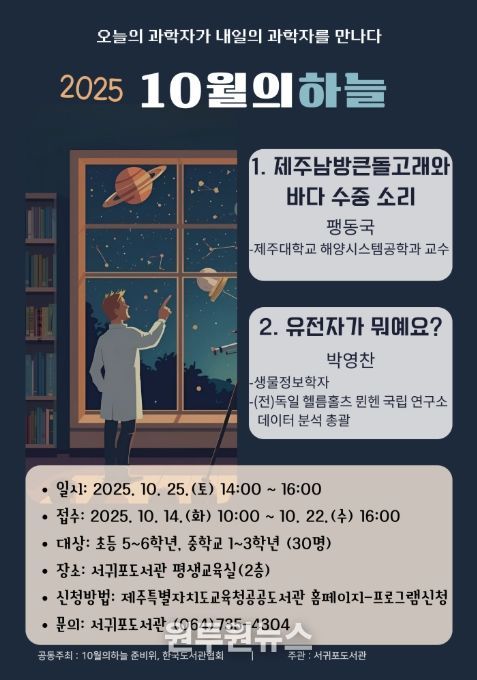 (원투원뉴스) 제주도교육청 서귀포도서관은 25일 오후 2시부터 서귀포도서관 평생교육실에서 한국도서관협회 및 ‘10월의 하늘’ 준비위원회와 함께 ‘10월의 하늘’ 프로그램을 운영한다.