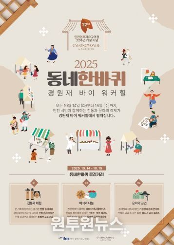 (원투원뉴스) 인천경제자유구역청은 오는 14일과 15일 이틀간 경원재 한옥호텔에서 제2회 경원재 시민페스티벌 ‘2025 동네한바퀴 경원재바이워커힐’을 개최한다고 밝혔다.