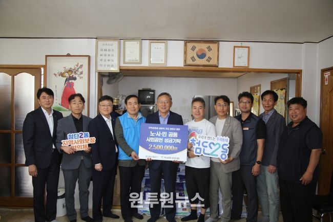 (원투원뉴스) 광주교통공사 조익문 사장과 김형일 노동조합위원장, 하나은행 호남 영업 그룹 우승구 부행장은 최근 지역 상생과 사회적 가치 실현을 위한 ‘가을 맞이 노사민 사랑 나눔 행사’를 갖고, 광주시 서구 가족센터와 첨단2동 봉산 경로당에 총 500만 원의 후원금을 전달했다.