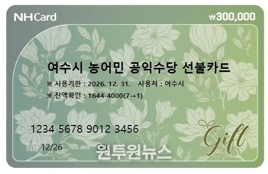 (원투원뉴스) 여수시는 2026년부터 농어민 공익수당 지급방식을 기존 ‘여수사랑상품권(지류형)’에서 ‘선불카드’로 전환한다고 밝혔다.