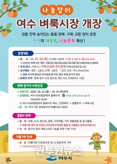 (원투원뉴스) 여수시는 오는 10월 18일 오후 1시부터 4시까지 거북선공원 잔디광장에서 2025년 ‘제5회 여수벼룩시장’을 개최한다.