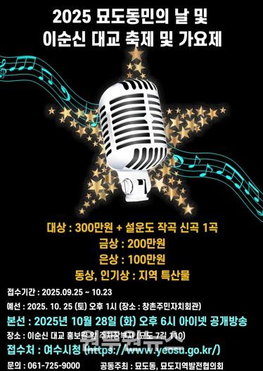 올해 처음으로 개최되는 이순신대교 가요제는 전국의 가수 지망생들이 참가해 실력을 겨루는 미래 스타 발굴 무대로 주목받고 있다. 참가 접수기간은 오는 10월 23일까지이며, 예선은 10월 25일 오후 1시 창촌주민자치회관에서, 본선은 10월 28일 오후 6시 축제 무대에서 열린다.