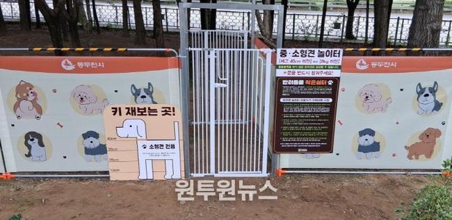 (원투원뉴스) 동두천시는 반려견과 시민이 함께 어울릴 수 있는 반려동물 문화공간을 조성하기 위해 강변로 156(강변근린공원 내)에 반려견 간이놀이터(이동식 울타리)를 설치하고 시범운영에 들어갔다고 밝혔다.