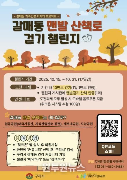 (원투원뉴스) 구리시는 가을철 주민들의 건강한 생활 습관 형성과 스트레스 완화를 위해 ‘갈매동 맨발 산책로 걷기 챌린지’를 오는 10월 15일부터 31일까지 17일간 운영한다고 밝혔다.