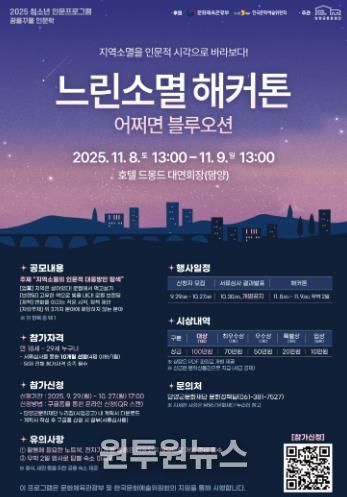(원투원뉴스) 담양군문화재단은 오는 11월 8일부터 9일까지 지역소멸 대응 인문사회적 문제해결방안을 탐색하는 「느린소멸 해커톤」을 개최한다고 밝혔다.