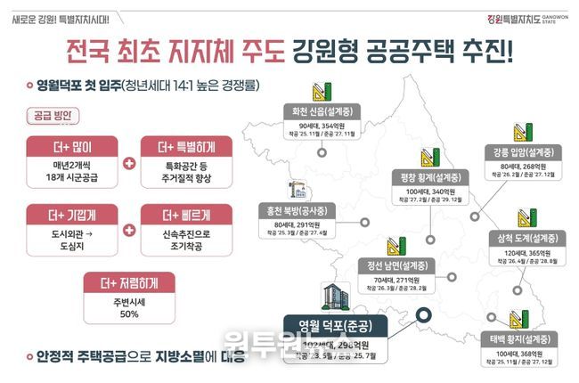 (원투원뉴스) 강원특별자치도는 청년과 신혼부부 등 지역 정착 인구 확대를 위한 안정적인 주택공급을 목표로 전국 최초의 지자체 주도형 주거모델인 강원형 공공주택 사업을 적극 추진하고 있다고 밝혔다.