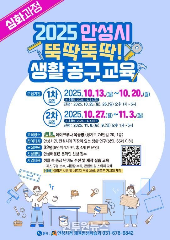 (원투원뉴스) 안성시는 시민들의 생활 자립 역량 강화를 위해 '뚝딱뚝딱 생활 공구[심화과정] 교육'을 오는 10월 25~26일과 11월 8~9일, 총 2회 주말 일정으로 운영한다고 밝혔다.