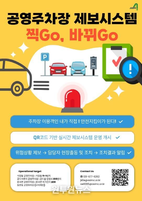 (원투원뉴스) 안성시시설관리공단은 10월 10일부터 원곡면, 석정동, 공도 저류지, 동본동(수탁예정)공영주차장 4개소 대상으로, 이용객이 직접 주차장의 위험요소나 이용 불편사항을 손쉽게 제보하고 개선에 참여할 수 있는 QR 코드 기반의 실시간 위험상황 제보시스템 “찍Go, 바뀌Go”를 운영한다고 밝혔다.