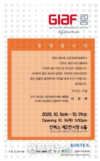 (원투원뉴스) 고양특례시가 후원하고 (사)한국예술문화단체총연합회 고양지회가 주최, (사)한국미술협회 고양지부가 주관하는 ‘제24회 고양국제아트페어’가 오는 10월 16일부터 19일까지 킨텍스 제2전시장 6홀에서 열린다.