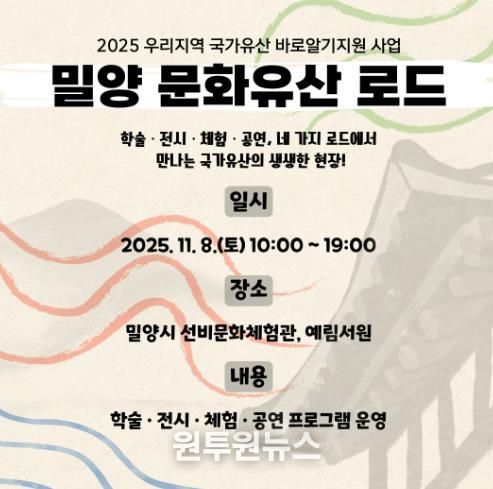 (원투원뉴스) 밀양문화관광재단은 오는 11월 8일 오전 10시부터 오후 7시까지 예림서원과 선비문화체험관 일원에서 지역 무형유산의 가치를 시민과 함께 나누는 ‘밀양 문화유산 로드’를 개최한다고 13일 밝혔다.