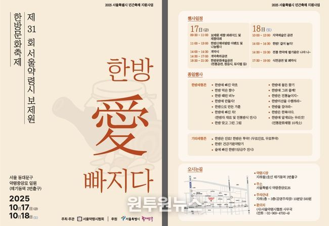 (원투원뉴스) 서울 동대문구는 오는 17일부터 18일까지 양일간 서울약령시 일대에서 ‘제31회 서울약령시 보제원 한방문화축제’를 개최한다고 밝혔다.